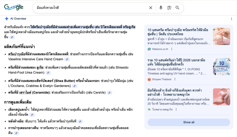 | โอกาสสำหรับแบรนด์ | ติดอันดับหน้า 1, Featured Snippets, โฆษณา | ถูกอ้างอิงในคำตอบ AI, เนื้อหาปรากฏในส่วนสรุป |