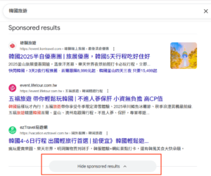 Google 在部分地區或查詢中,已允許使用者直接點擊「隱藏贊助廣告結果」。這項用戶端的主動控制權,直接衝擊了廣告主的投放效益。