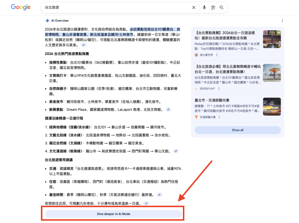 SEO 小技巧: 在內容中自然加入問句與對話式表達,例如「什麼是 Google AI 模式?」或「AI 模式如何影響 SEO?」